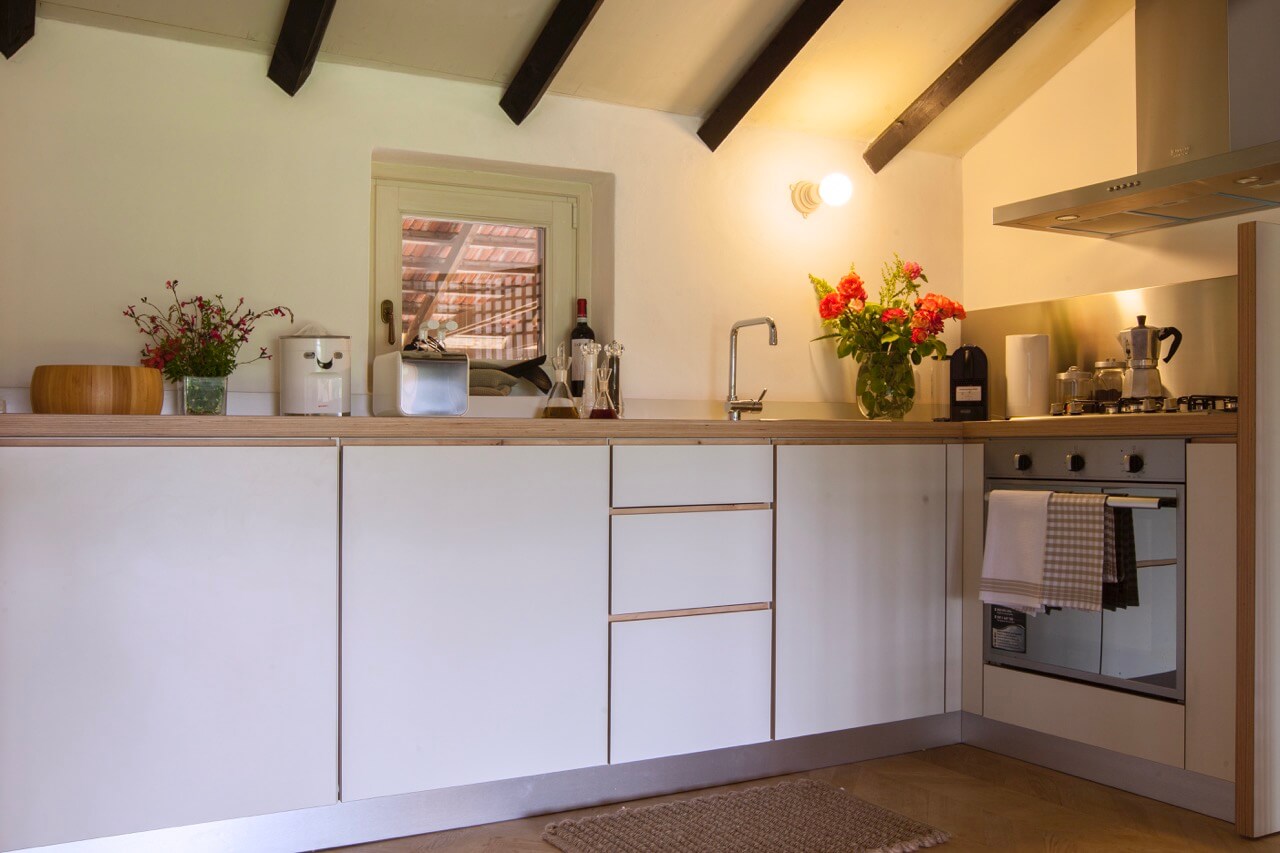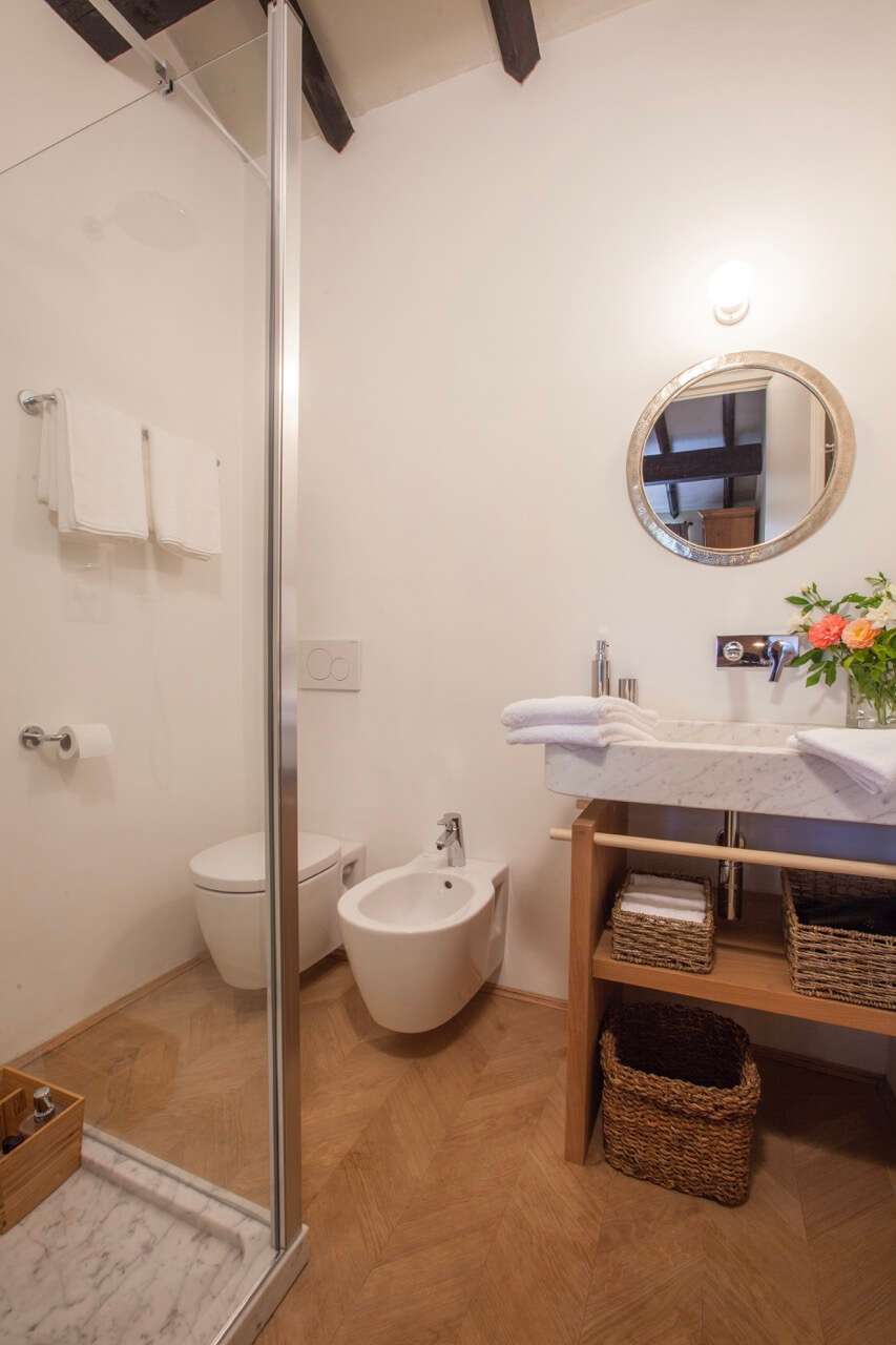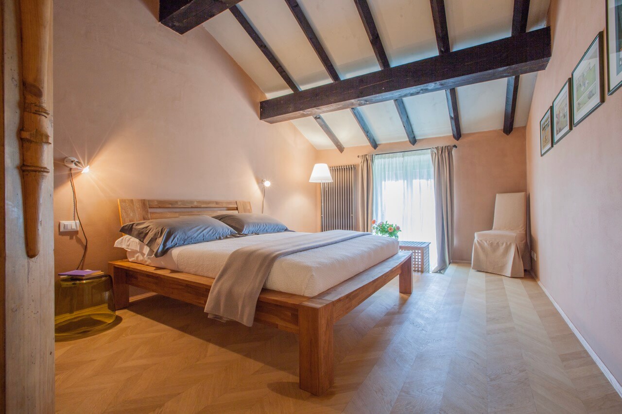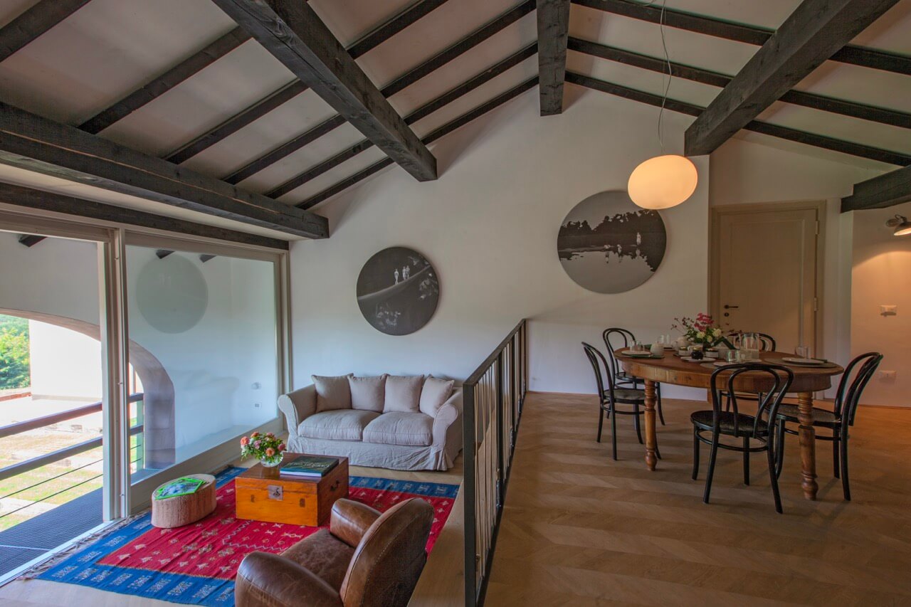 Situato al primo piano della grande casa colonica che costituisce il corpo centrale de Il Borgo, questo appartamento arredato con mobili antichi, alle pareti opere d’arte contemporanea, rappresenta la soluzione perfetta per chi desidera piena privacy e un grande confort. La zona giorno open space è composta da sala da pranzo con cucina e soggiorno, caratterizzata da grande porta finestra ad arco che si apre su un balcone con una splendida vista sulla valle e il cortile interno del Borgo.
