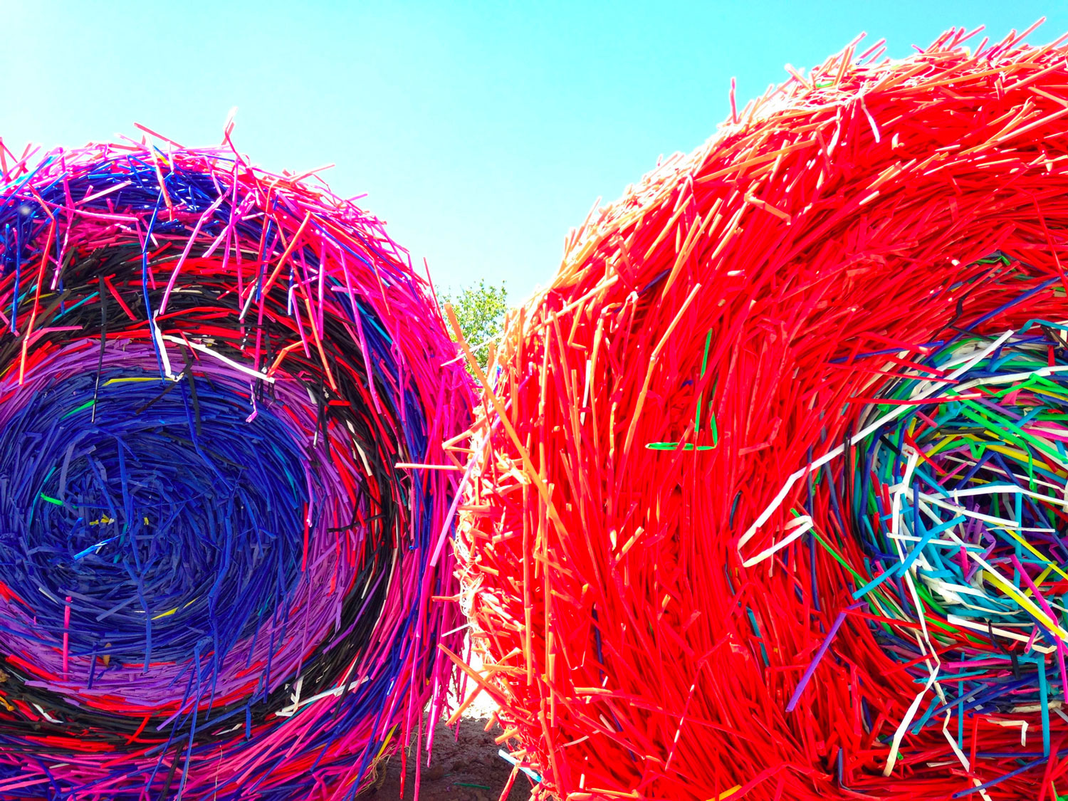 The project BALES 2014/2017 was developed for the park of the Kunstareal in Munich, transforming the urban site into an agricultural field in which baling presses gathered industrial straw in bright fluo colors scattered by the artist on the well-groomed lawns of the park into round multicolored bales.